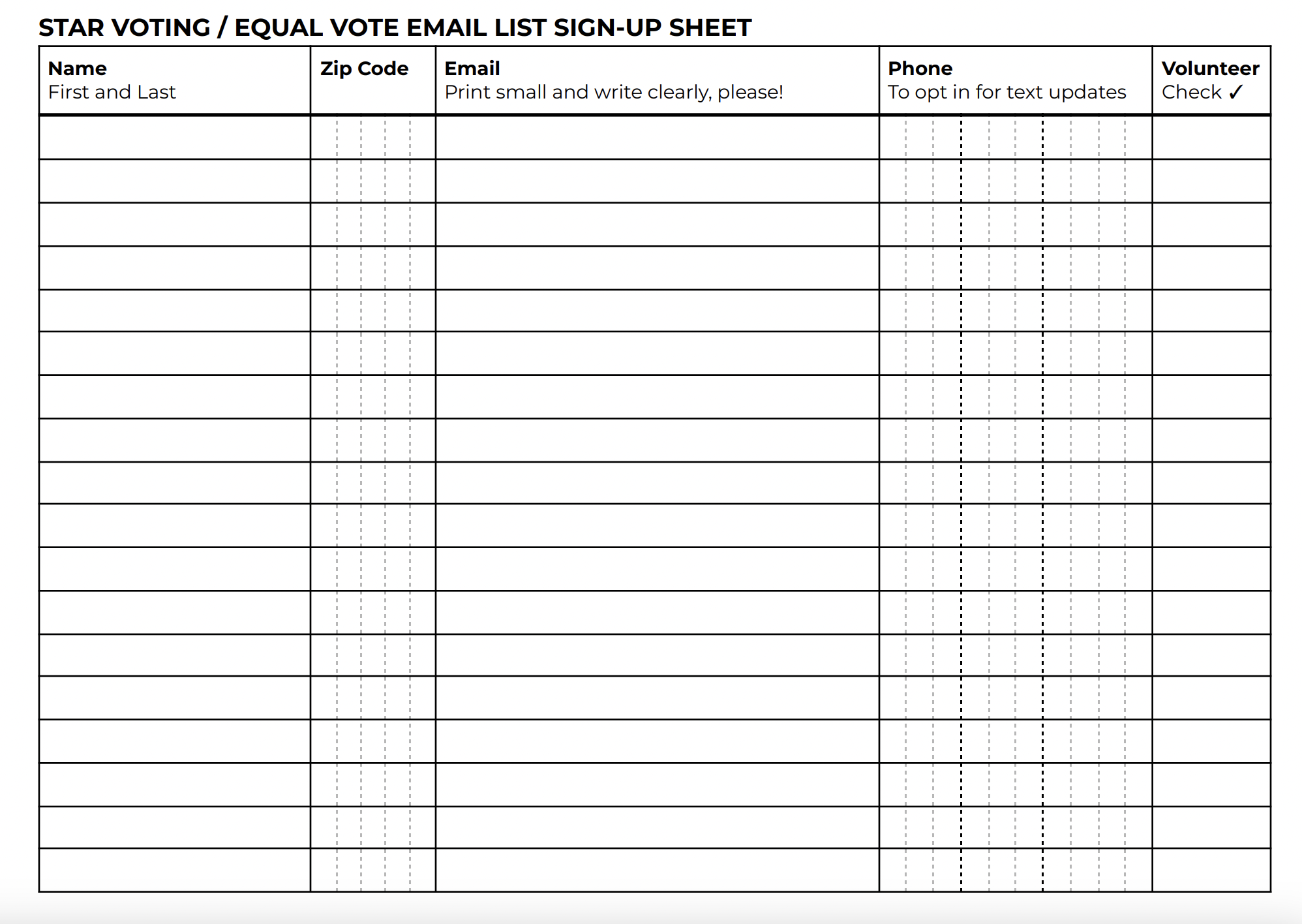 Make sure to have at least 3 copies of the sign up sheet on a clipboard in the middle of the table for a large event. Better yet, have a tablet on the table where people can sign up through the website at starvoting.org/join. |